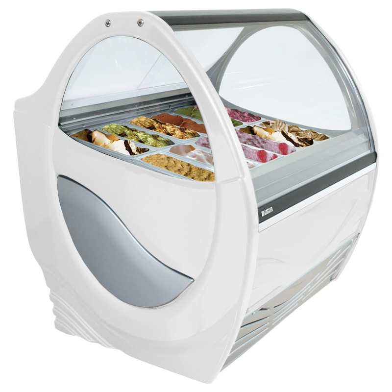 Barquillera UDR 12 sabores, Gran Diseño, cristal curvo templad, permite gran exhibicion del producto, iluminacion interior y microprocesador con deshielo automatico, tachos de 5 lts formato italiano.